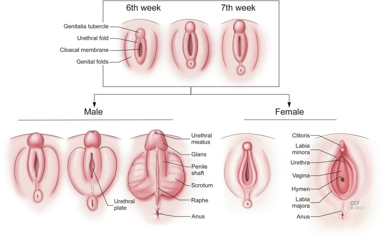 An understanding of the embryologic development of the internal and external genitalia is crucial in discussing DSD. We will first discuss the basic steps of normal sexual differentiation so that we can then explain the mechanisms that may alter normal development. Chromosomal gender is determined at the time of conception, as XY chromosomes will lead to male development and XX chromosomes will progress to female development. Early in development, primordial undifferentiated germ cells are arranged in the yolk sac; they will later migrate, become primitive testicles or ovaries, and assist in sexual development.