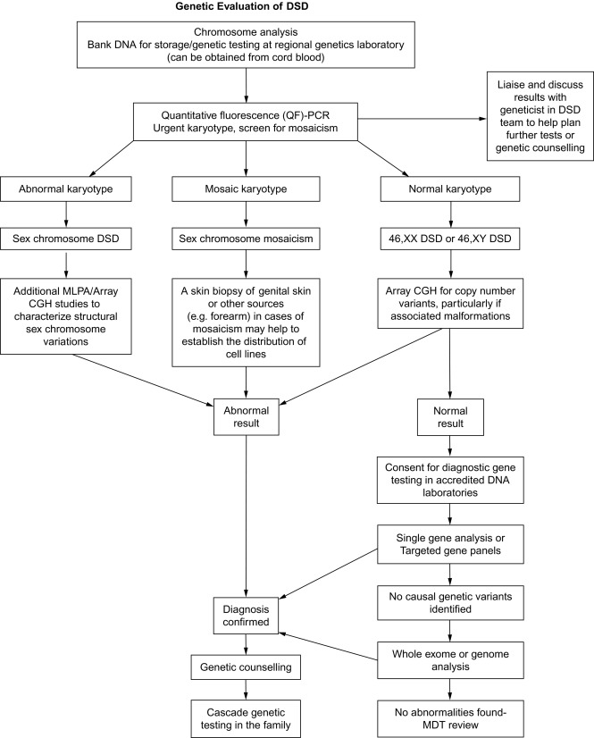 These changed views have led to the development of consensus guidelines to address the evaluation and management of DSD individuals at birth. A central theme of these guidelines is that only a minority (20%) of DSD newborns will have a definitive genetic or molecular diagnosis. Evaluation begins with careful physical examination of the newborn by an experienced clinician to evaluate the external genitalia, including a detailed investigation of the labioscrotal folds and their fusion; the presence or absence of gonads in the abdominal, inguinal, or scrotal position; the size of the phallus and the site of the urinary meatus. These landmarks may not be readily apparent on external examination and thus may require surgical exploration. Prior to any exploration, however, the clinician should follow a well-established algorithm that attempts to specify the chromosomal, molecular, and/or anatomic diagnosis of the DSD. A reformatted algorithm to establish the chromosomal or molecular etiology of each specific DSD is shown in Fig. 4.2 ; it begins with karyotyping to establish the distinction between an overvirilized 46XX-chromosomal female versus an undervirilized 46XY male, or chromosomal mosaicism. Further investigation includes hormonal testing, including 17-OH progesterone, testosterone, gonadotropin-releasing hormone (GnRH), anti-Müllerian hormone, an electrolyte panel, and urinalysis. Abdominal and pelvic ultrasound should be performed to determine the presence or absence of Wollfian or Müllerian structures. Hormonal stimulation tests can be performed as well, including human chorionic gonadotropin (hCG) and adrenocorticotrophic hormone (ACTH) stimulation. Last, specific genetic determination, although rare, as mentioned earlier, can be performed by microarray or full-sequencing technologies of known sex-determining genes in an attempt to identify a specific genetic defect. Notably, other than the physical exam and imaging, all these laboratory tests take more than a week to be completed. This delay can cause additional stress to the family, and, as providers, we should be sensitive to this.