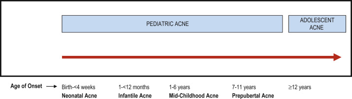 Pediatric acne is the terminology applied to acne occurring from birth through 11 years of age; adolescent acne describes patients from age 12 to adulthood. The contemporary classification of pediatric acne based on age of onset of the disease is shown in Figure 8-1 .