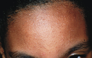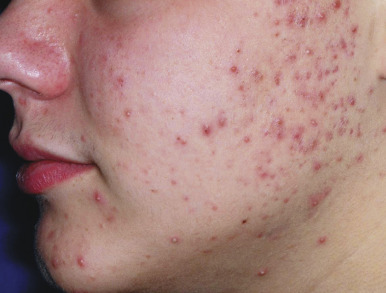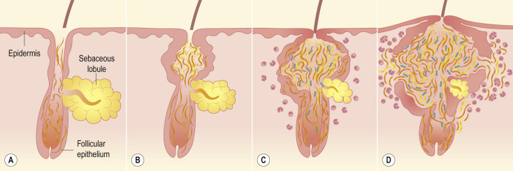 Although the pathway in Figure 8-2 has traditionally been used to explain acne pathogenesis, ongoing research continues to shed more light on these processes. Subclinical inflammation, even before the formation of the microcomedone, may be present in acne as demonstrated by upregulated levels of inflammatory cytokines and cells in uninvolved skin from acne patients. Another study supporting this hypothesis utilized digital photographic images to follow the evolution of acne lesions and showed that nearly 30% of inflammatory lesions arose from normal-appearing skin (as opposed to comedones). Further elucidation of the mechanisms that give rise to acne lesions will enable better targeting of acne therapies.
