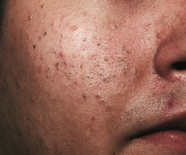 Acne presents with a combination of the various lesion types previously discussed: comedones, papules, pustules, cysts, nodules, scarring, and dyspigmentation. The earliest lesion type is usually the comedone, and mild acne may be limited to these lesions ( Figs. 8-3 and 8-4 ). With increasing severity, patients develop inflammatory lesions, including papules and pustules ( Figs. 8-5 and 8-6 ). Nodules and cyst-like nodules may be present in patients with moderate to severe disease ( Figs. 8-7 and 8-8 ) and may result in permanent acne scarring ( Figs. 8-9 and 8-10 ). Dyspigmentation is a common sequela, especially in patients with darker complexions ( Figs. 8-11 and 8-12 ). The primary sites for acne lesions correlate with the areas most concentrated with sebaceous glands: the face, chest, back, and shoulders. In patients with regressing acne lesions, macular erythema ( Fig. 8-13 ) and hyperpigmentation are commonly seen. Although patients commonly regard these as active lesions and “scars,” they usually imply effectiveness of the therapy, and their temporary nature should be explained to the patient. The scarring that occurs in patients with the more severe papulopustular and nodulocystic forms of acne develops because of fibrous contraction after the inflammatory phase. In addition to sharply punched-out pits and craters, hypertrophic or keloidal scars may also develop. The severity of the scarring depends on the depth and degree of the inflammation and on the patient’s individual susceptibility.