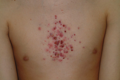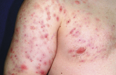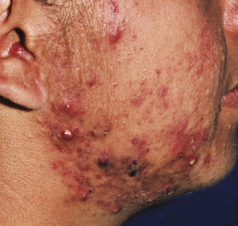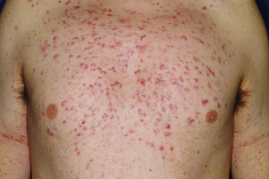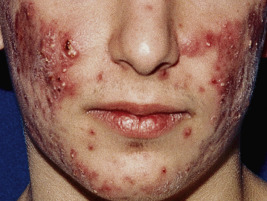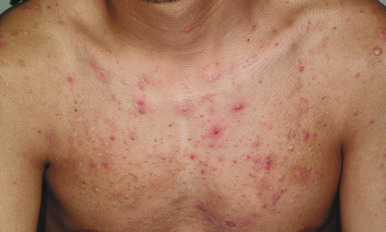 Acne fulminans is a rare and severe form of acne vulgaris, occurring almost exclusively in young males. Patients present with an acute onset of painful, nodular, and occasionally ulcerative acne lesions concentrated on the chest ( Fig. 8-14 ), shoulders, back, and face. Fever, leukocytosis, and musculoskeletal pain may also be present, and the skin lesions usually result in permanent scarring. Osteolytic bone lesions may be present, especially in the clavicle, sternum, and long bones. Systemic corticosteroids are the mainstay of therapy, with the addition of isotretinoin after the acute inflammatory stage has subsided.