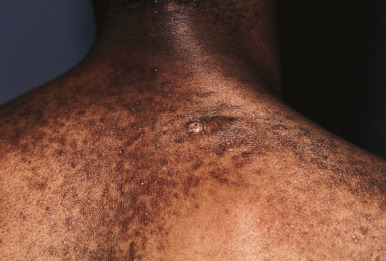 Dyspigmentation (usually hyperpigmentation)