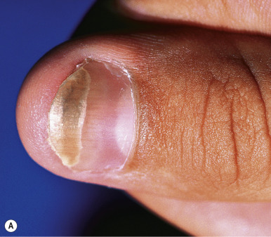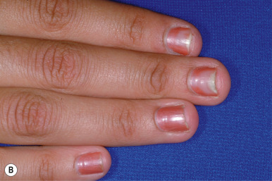 Doxycycline has the benefit of sustained absorption in the presence of food but may result in severe photosensitivity reactions. One such type of reaction is “photoonycholysis,” which presents with erythema and separation of the nail plate from the nailbed ( Fig. 8-16 ). These patients usually also have an associated photosensitivity rash on exposed areas of skin. Pill esophagitis is another potential side effect of oral doxycycline and can usually be prevented by taking the medication with a full glass of water and avoiding recumbency for at least 1 hour after dosing. In a retrospective cohort study of patients with acne who were treated with oral tetracycline-class antibiotics, the hazard ratio (HR) for developing inflammatory bowel disease (IBD) was increased for all agents in this class but most notably for doxycycline (HR of 1.63). However, a definitive causal link between tetracycline-class antibiotics and development of IBD remains to be proven. Off-label use of subantimicrobial-dose doxycycline hyclate (20-mg tablets taken twice daily) has been reported in acne vulgaris and has been shown to significantly reduce the number of lesions without any detectable antimicrobial effect on skin flora or alteration of resistance patterns. An extended-release formulation of doxycycline is available and can be administered once daily.