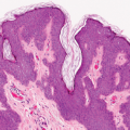 The histopathologic features are a combination of those observed in psoriasis and spongiotic dermatitis. Mild cases may exhibit only a slight subacute spongiotic dermatitis. The stratum corneum contains focal areas of parakeratosis, with a predilection for the follicular ostia, a finding known as “shoulder parakeratosis.” Occasional pyknotic neutrophils are present within parakeratotic foci. There is moderate acanthosis with regular elongation of the rete ridges, mild spongiosis, and focal exocytosis of lymphocytes. The dermis contains a sparse mononuclear cell infiltrate. In HIV-infected patients, the epidermis may contain dyskeratotic keratinocytes, and the dermal infiltrate may contain plasma cells.