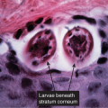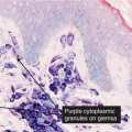 A biopsy of the rash shows non-specific perivascular lymphocytic inflammation with epidermal spongiosis and mild vesiculation with scattered degenerated keratinocytes. Biopsies from AIDS patients with measles show necrosis of clusters of keratinocytes in the upper spinous layer and granular layer of the epidermis. Unlike in erythema multiforme the necrosis occurs in the basal layer keratinocytes. Multinucleated keratinocytes may or may not be prominent in the measles biopsy. Cytoplasmic swelling of the keratinocytes in the granular layer may be present even when multinucleated cells are sparse.