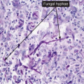 Fig. IIIA1.e. Tinea versicolor, medium power. A Grocott stain demonstrates the fungal forms in the stratum corneum.