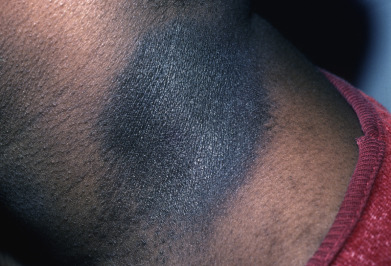 Wood’s light examination will distinguish these two patterns of postinflammatory hyperpigmentation. Lesions of hyperpigmentation tend to be tan to brown and may have a gray hue, caused by dermal melanin ( Fig. 36.2 ).
