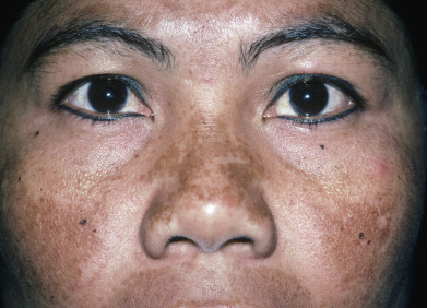 Melasma is characterized by brown patches, typically on the malar prominences and forehead. The forearms may also be affected. There are three clinical patterns of facial melasma: centrofacial, malar, and mandibular. The centrofacial and malar patterns constitute the majority ( Fig. 36.3 ), but most patients have multiple types, so this classification is not very useful therapeutically. The pigmented patches are usually sharply demarcated. Although melasma has classically been classified as epidermal or dermal, based on the presence or absence of Wood’s light enhancement, respectively, most cases show both epidermal and dermal melanin. There are nuclear changes within keratinocytes that indicate that epidermal melanin units are altered. Dermal melanophages are a normal finding in sun-exposed Asian skin. Independent of Wood’s light findings, a therapeutic trial of some form of hypopigmenting agent should be offered.