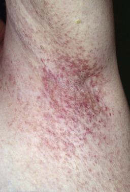 Galli-Galli disease is now recognized as an acantholytic variant of DDD, also caused by mutations in the KRT5 gene. The skin lesions are 1–2 mm, slightly keratotic, red to dark-brown papules, which are focally confluent in a reticulate pattern ( Fig. 36.6 ). The skin lesions favor skinfolds, although other skin sites may also be involved. The neck, axillae, upper extremities, dorsal hands, trunk, groin, and even the scrotum and lower extremities may be affected. Histologically, there is prominent digitate downgrowth of the rete ridges, identical to that seen in DDD. The characteristic histologic feature is a suprabasilar cleft and suprapapillary thinning of the epidermis. There is no dyskeratosis, as seen in Grover disease. Ablative laser treatment led to axillary symptom resolution in one patient.