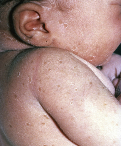 Also called transient pustular melanosis (TPM) is present at birth. Newborns present with 1–3 mm, flaccid, superficial fragile pustules. Some of the pustules may have already resolved in utero, leaving pigmented macules ( Fig. 36.8 ). Lesions can occur anywhere. Numerous lesions and lesions up to 1 cm in diameter have been reported, but any new pustules forming after birth should raise suspicion for another benign pustulosis such as erythema toxicum neonatorum or, more important, infections such as Staphylococcus aureus or herpes simplex. In dark-skinned infants, pigmented macules may persist for weeks or months after the pustules have healed. Transient neonatal pustular melanosis is observed more frequently in infants with skin types III-VI (approximately 5% vs less than 1% of infants with skin types I-II) and may be more common after vaginal than cesarean delivery.