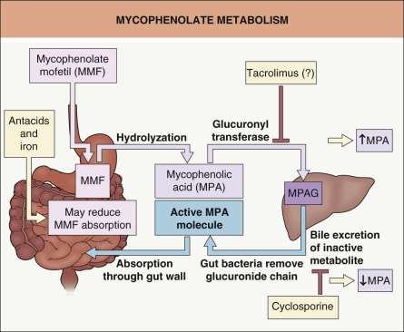 Common drugs that form complexes with other drugs include antacids, sucralfate, and bile acid sequestrants (e.g. cholestyramine, colestipol, colesevelam) ( Table 131.2 ). A significant interaction occurs between multivalent cations – such as calcium, aluminum, iron and magnesium – and tetracyclines or fluoroquinolone antibiotics. For example, there is an 85% reduction in the absorption of ciprofloxacin when ingested 5–10 minutes after a dose of an aluminum hydroxide/magnesium hydroxide antacid . These interactions can be easily avoided by administering the fluoroquinolone at least 2 hours before or 6 hours after the antacid or iron. Alendronate, as well as other bisphosphonates prescribed for the prevention and treatment of osteoporosis, forms complexes with cations and several other drugs, thereby further decreasing their already low oral absorption. Once-weekly dosing reduces the opportunity for bisphosphonate-related interactions. When mycophenolate mofetil and iron preparations were administered concomitantly, a significant decrease in mycophenolate mofetil absorption was observed ( Fig. 131.1 ) .