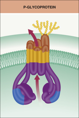 Membrane-bound transport systems may also determine drug disposition . These transporters are found in multiple tissues and actively pump drug molecules either out of cells (efflux) or into cells (uptake). PGP is an ATP-dependent plasma membrane glycoprotein belonging to the superfamily of ATP-binding cassette transporters that functions primarily as an efflux pump ( Fig. 131.2 ) . Other transporters include the organic anion and organic cation transporters. In humans, the multidrug resistance (MDR) genes, including MDR1 , encode membrane glycoproteins that function as drug transporters and hence affect both drug absorption and elimination.