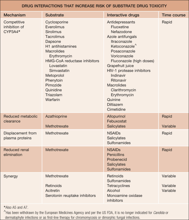 | Induction of CYP3A4 † | Calcineurin inhibitors Cyclosporine Tacrolimus Oral contraceptives Corticosteroids Dexamethasone Methylprednisolone PrednisoneWarfarin | Anticonvulsants Carbamazepine Phenytoin Phenobarbital Antituberculous agents IsoniazidRifampin Dexamethasone Griseofulvin | 1–2 weeks |
