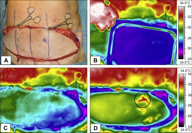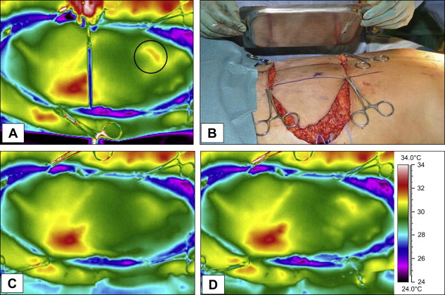 One of the disadvantages of perforator flap surgery is the complex dissection of perforators. A meticulous microsurgical technique is required to avoid inadvertent damage to the perforator. In 2006, we reported on the intraoperative use of DIRT in free DIEP flap surgery. After the selected perforator is dissected and with the flap still at the lower abdomen, DIRT can be used to confirm patency of the perforator. Normally a hot spot will be seen on the IR images that correlates with the location of the entrance point of the perforator into the flap. The quality of the perforator can be assessed by analyzing the rate and pattern of rewarming after the skin area above the perforator is exposed to a conductive thermal challenge. A metal plate at room temperature is gently applied to the skin surface for 30 seconds ( Figs. 9 and 10 ).