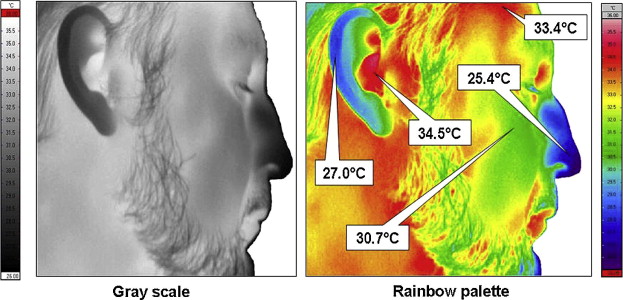 The low sensitivity of early IR cameras made them unsuitable for detecting subtle changes in temperature. Improved IR camera technology with greatly improved temperature sensitivity (<0.1°C) and computer image analysis have led to a resurgence of interest in the applications of medical IR thermography. Modern imaging systems offer real-time digital image capture in combination with state-of-the-art computer-assisted image analysis. In these systems, the thermal images are gray scale temperature coded. It is usual to apply additional color coding, with different temperatures being represented by different colors, which greatly helps in interpreting images. The rainbow palette is a frequently used color coding in medical IR thermography with the red end of the scale representing warm temperatures and the blue end representing colder temperatures ( Fig. 2 ). IR thermography is now used in major fields of medicine, including neurology, rheumatology, dermatology, oncology, and surgery. In free-flap surgery, the perfusion and reperfusion of the flap are crucial for successful surgery. It is therefore surprising that the use of IR thermography in flap surgery is so scarcely reported in the literature.