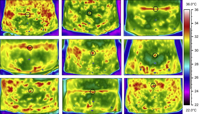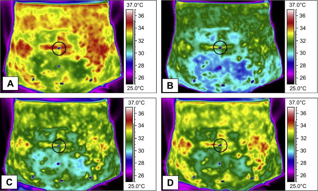 Because of the interference from complex vascular patterns, it has been proposed to monitor the thermal recovery process after exposure of the area of interest to thermal stress. This technique is called dynamic IR thermography (DIRT). Thermal stress can be achieved by, for example, fan cooling or water immersion, and by applying cold or warm objects to the skin surface. The rate and pattern at which the skin temperature recovers toward its equilibrium is registered with an IR camera. Fig. 3 illustrates the rewarming of the lower abdomen after 2 minutes of fan cooling. A special form of DIRT is the perfusion of tissue with warm or cold perfusate, as for example in organ transplantation and cardiac surgery.