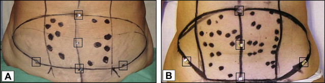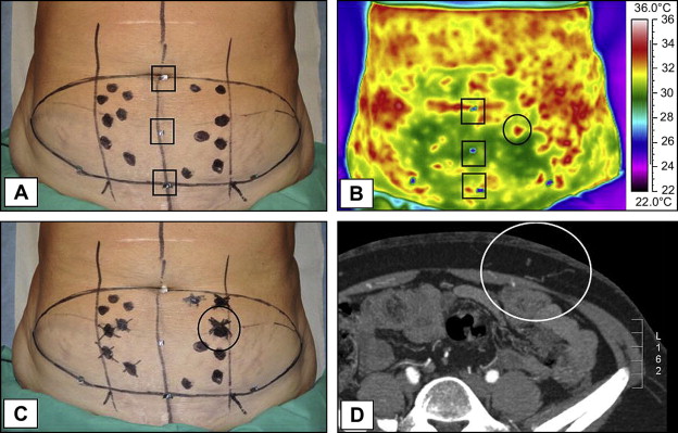 Itoh and Arai illustrated with 2 clinical cases that a perforator flap could be based on the perforator that was identified by the location of a hot spot on the thermal image during the rewarming of the skin after a cold challenge. In 2009, we reported on the value of the use of DIRT in the preoperative planning of the DIEP flap. After the outline of the flap had been drawn on the lower abdomen, the locations of arterial Doppler sounds were marked on the skin with black dots ( Fig. 4 ). All patients were examined in a special examination room with a room temperature of 22°C to 24°C and constant humidity and air circulation. Typically, the exposed abdomen was subjected to an acclimatization period at room temperature before the DIRT examination. A desktop fan was used to deliver the cold challenge by blowing air at room temperature over the abdomen for 2 minutes. This cold challenge causes visible changes in skin temperature that are well within the physiologic range, and has a short recovery period of approximately 5 minutes. The results from the analysis of the DIRT examination for each individual patient revealed large variability in the number and positions of hot spots between the left and right side. There was also large variability in the number and positions of hot spots among patients ( Fig. 5 ). Analysis of the rate and pattern of rewarming of the hot spots allowed a qualitative assessment of all the perforators at the same time. Hot spots that showed rapid and progressive rewarming could be related to suitable perforators intraoperatively. A rapid rewarming at the hot spot indicates that the perforator is capable of transporting more blood to the skin surface than a hot spot with a low rate of rewarming. A rapid progression of rewarming at the hot spot suggests a better-developed vascular network around the hotspot. It appeared that whereas all first-appearing hot spots could be associated with the location of an arterial Doppler sound, not all arterial Doppler sound locations could be related to a hot spot. In addition, the selected hot spot correlated well with a suitable perforator seen on multidetector row computed tomography (MDCT) scans ( Figs. 6 and 7 ).