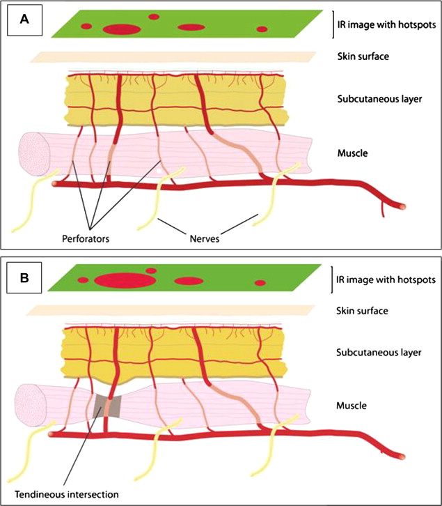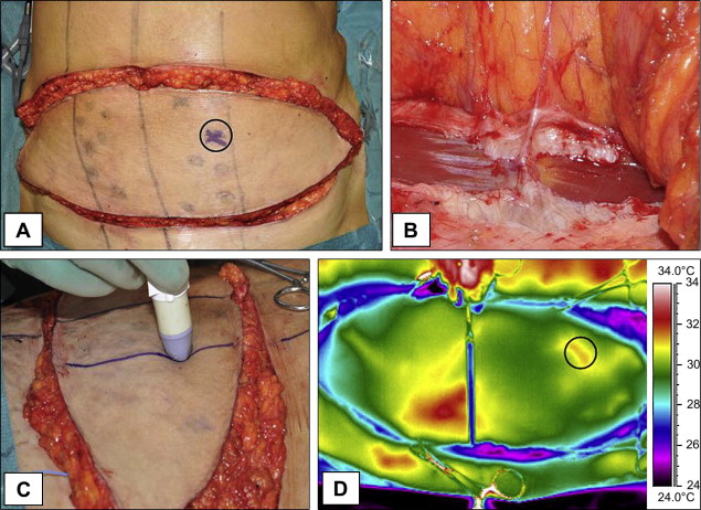 The location of the hot spot on the skin could easily be related to the location where the perforator passed through the anterior rectus fascia, although the hot spot as well as the associated Doppler sound were slightly more laterally positioned. The more laterally positioned Doppler sounds and hot spots are caused by the lateral course of vessels supplying the skin, as shown by the eminent surgeon and anatomist John Hunter (1728–1793). He explained that the orientation of vessels was a product of differential growth that had occurred in that area from the stage of fetus to adulthood. Giunta and colleagues found that the preoperative Doppler location on the skin was located within an average distance of 0.8 cm from that of the exit point of the perforator through the fascia. Interestingly, in our study the selected hot spot on the DIRT images was always associated with an audible Doppler sound and a suitable perforator.