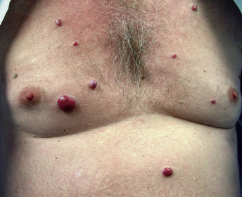 Cutaneous changes are common in this disorder, and reported changes include diffuse hyperpigmentation (93% to 98%); peripheral edema (92%); and sometimes anasarca, hypertrichosis (78% to 81%), a poorly characterized skin thickening (77% to 85%), and digital clubbing (56%). Cutaneous angiomas occur in 24% to 44% of patients and include cherry, verrucous, subcutaneous, or “glomeruloid” angiomas ( Fig. 21-3 ). The histopathological finding of a glomeruloid angioma is highly indicative of this syndrome. That circulating levels of vascular endothelial growth factor (VEGF) are markedly increased in these patients may provide some explanation for the vascular changes in POEMS. This increase in VEGF may come from aggregating platelets overly rich in VEGF, which could provide very high local microcirculatory concentrations of VEGF. In patients with POEMS in association with multicentric Castleman’s disease, viral interleukin (IL)-6 produced by human herpesvirus-8 could also lead to increased circulating levels of VEGF. Sclerodermoid changes, facial atrophy, flushing, Terry’s nails, acrocyanosis, Raynaud’s phenomenon, and sicca syndrome have also been described. Biopsy findings of the skin are often nonspecific, but include hyperpigmentation, dermal thickening caused by edema and an increase in collagen and proteoglycan, microvascular proliferation, and occasional large fibroblasts in the dermis.