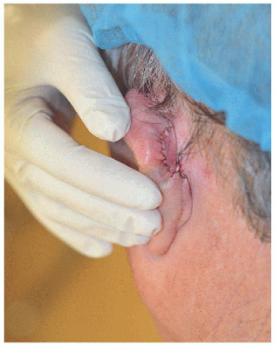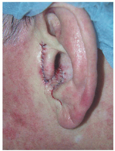 The preauricular cheek holds a reservoir of loose tissue for most people, especially in older patients. This 76-year-old man had enough loose tissue in the preauricular cheek to allow creation of a transposition flap, which would transpose around the tragus and repair the defect on the medial aspect of this structure (Figs. 7.3B and C). As with other transposition flap repair, proper planning is key to ensure that an adequate amount of tissue is transposed and that it reaches all of the edges of the surgical defect. Like other transposition flaps, closure of the secondary defect first allows the flap to more easily transpose into place, essentially “falling” into the surgical defect.
