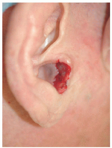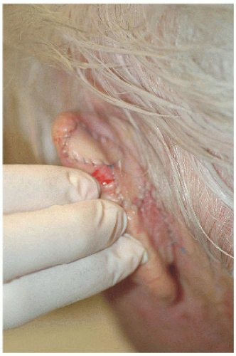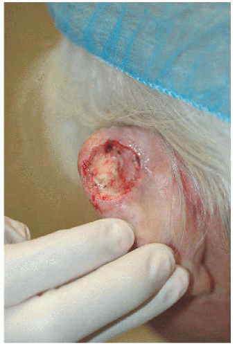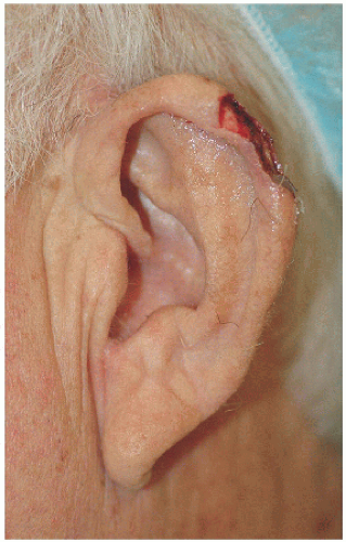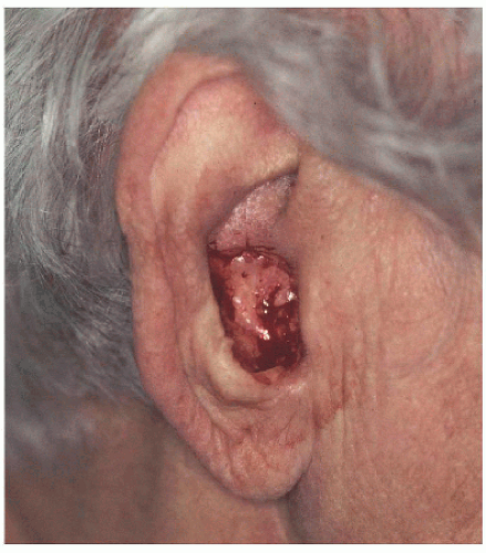 ![]() Figure 7.2A. Surgical defect on the right medial (or posterior) pinna adjacent to the helical sulcus. |