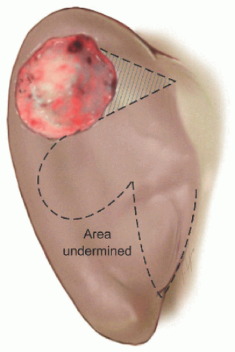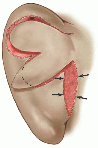 If a defect is adjacent to the postauricular sulcus, a rhombic transposition flap can be designed. For defects away from the postauricular sulcus, a bilobed transposition flap can effectively walk tissue across the pinna.