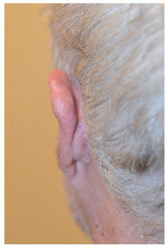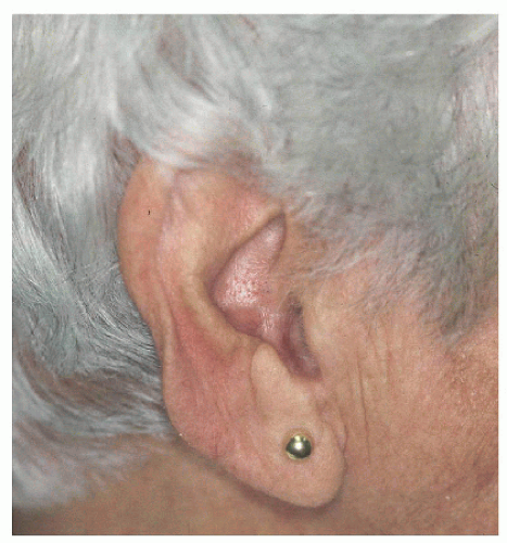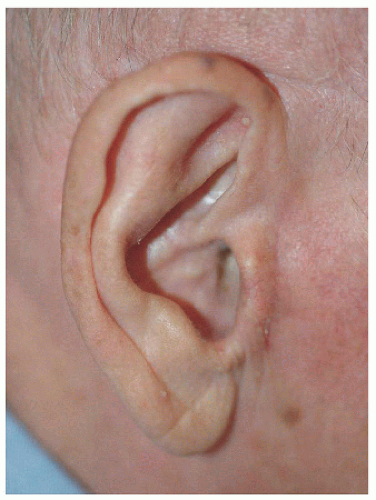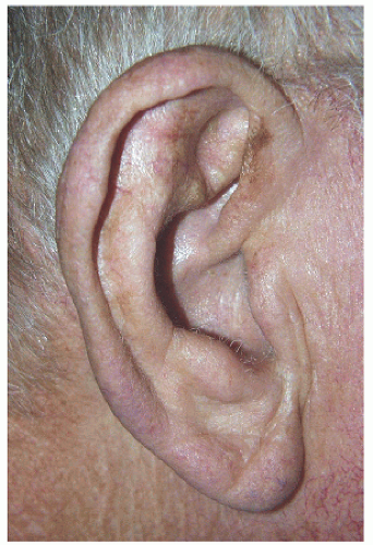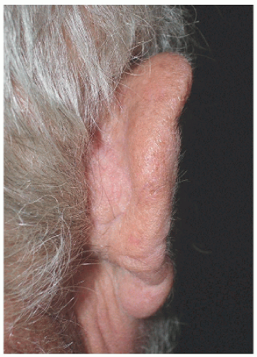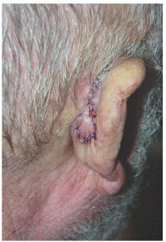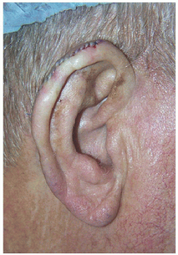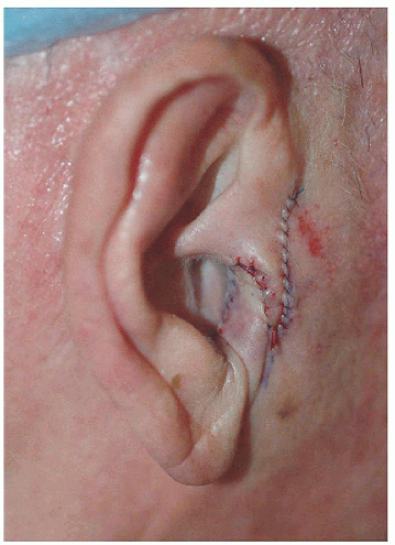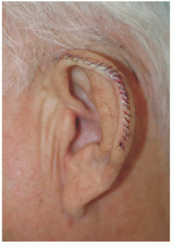 The ear is a complex structure whose lateral surface provides minimal loose tissue for side-to-side or flap repair. The skin on this side is bound down to a convoluted cartilaginous structure with convex and concave surfaces. As such, repair on the lateral surface is usually limited to second intention healing, skin graft, or a flap from the medial pinna or other nearby cosmetic unit (i.e., preauricular cheek or postauricular scalp). The skin on the medial surface of the ear is a little looser and may provide adequate tissue for side-to-side or flap repair of small- to medium-sized defects, although flap repair frequently recruits tissue from the postauricular sulcus area. The helical rim provides the characteristic shape to the pinna, and reconstruction is most successful if the shape, size, and appearance of this contiguous structure is maintained. Fortunately, for many defects on the helical rim, the inferior helical rim and lobule provide an adequate reservoir of loose tissue from which to fashion a local flap repair.