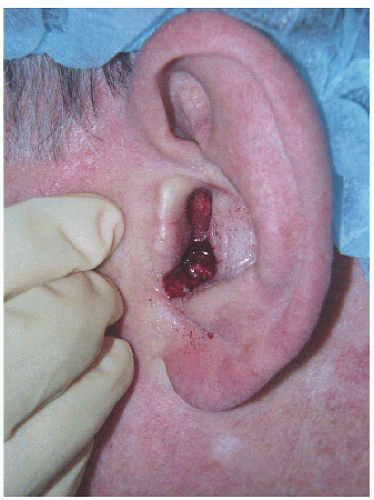 ![]() Figure 7.3D. Surgical defect on the inferior aspect of the conchal bowl, extending to the external auditory meatus (blood-soaked cotton ball in the external auditory canal). |