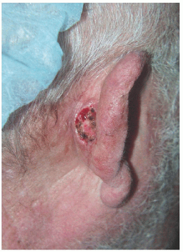 ![]() Figure 7.2D. Larger surgical defect on the posterior or medial pinna and adjacent to the postauricular sulcus. |