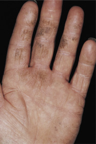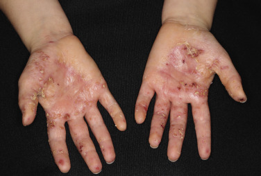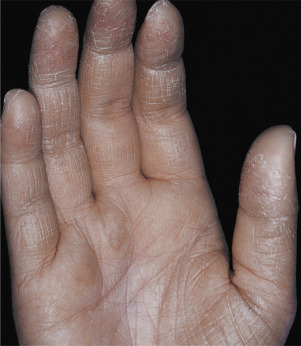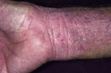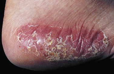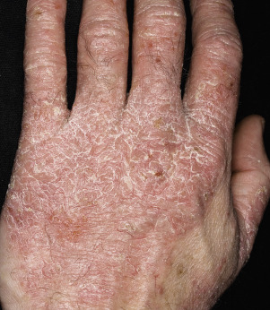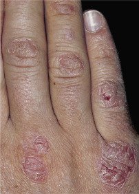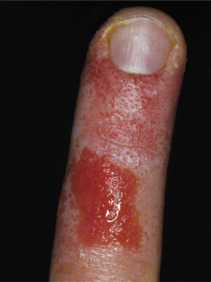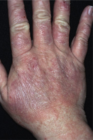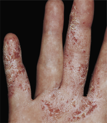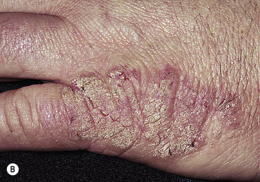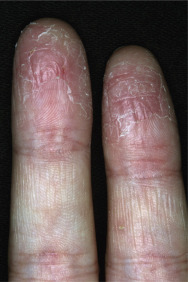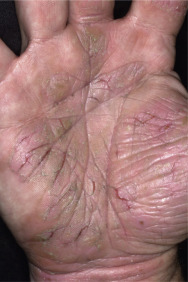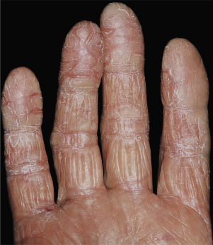 Dryness and chapping are the initial changes ( Fig. 3.25 ). Very painful cracks and fissures occur, particularly in joint crease areas and around the fingertips. The backs of the hands become red, swollen, and tender. The palmar surface, especially that of the fingers, becomes red and continues to be dry and cracked. A red, smooth, shiny, delicate surface that splits easily with the slightest trauma may develop. These are subacute eczematous changes ( Fig. 3.26 ).