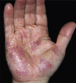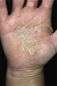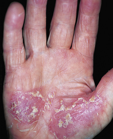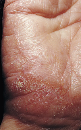| Hyperkeratotic hand eczema | Sharply demarcated areas of thick scaling or hyperkeratosis on the palms (and frequently on the soles) are characteristic, as are painful fissures. Vesicles are absent. The condition may be confused with psoriasis, but there is little or none of the redness and none of the scaling or nail changes typical of psoriasis. The condition is more common in middle-aged and elderly persons and in men. The cause is unknown. |