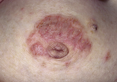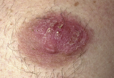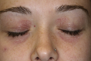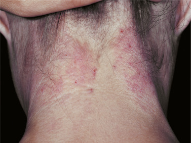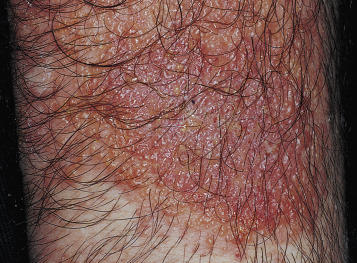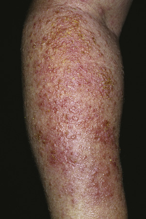 Acute eczematous inflammation occurs with further irritation, creating vesicles that ooze and crust. Itching intensifies, and excoriation leads to infection ( Figs. 3.27 and 3.28 )