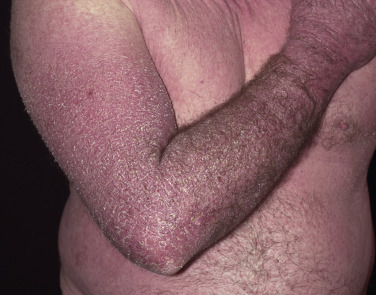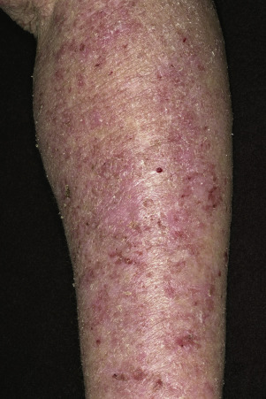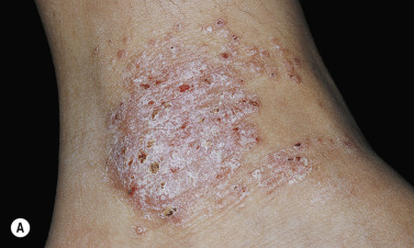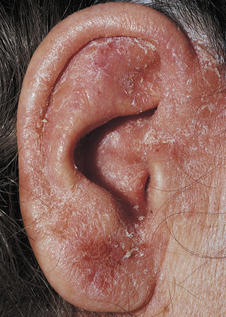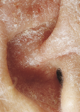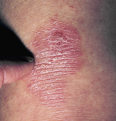 Erythema and scale are present in various patterns, usually with indistinct borders ( Figs. 3.4 and 3.5 ). The redness may be faint or intense ( Figs. 3.6 to 3.9 ). Psoriasis, superficial fungal infections, and eczematous inflammation may have a similar appearance ( Figs. 3.10 to 3.13 ). The borders of the plaques of psoriasis and superficial fungal infections are well-defined. Psoriatic plaques have a deep, rich red color and silvery white scales.
