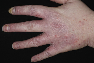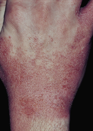 The backs of the hands, particularly the fingers, are affected ( Fig. 3.29 ). The dermatitis begins as a typical irritant reaction with chapping and erythema. Several forms of eczematous dermatitis evolve; erythema, edema, vesiculation, crusting, excoriation, scaling, and lichenification appear and are intensified by scratching. Management for atopic hand eczema is the same as that for irritant hand eczema.