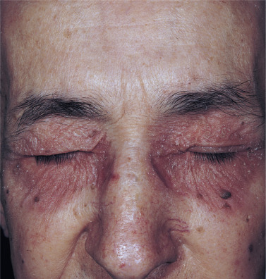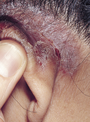 Eczematous plaques that remain bright red during treatment with topical steroids may be infected ( Fig. 3.14 ). Infected subacute eczema should be treated with appropriate systemic antibiotics, which are usually those active against Staphylococci. Systemic antibiotics are more effective than topical antibiotics or antibiotic–steroid combination creams.