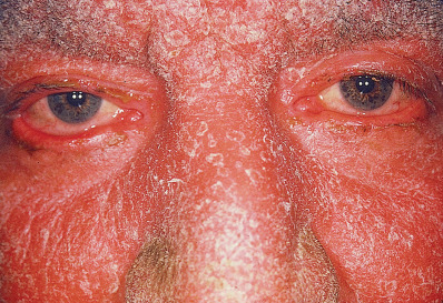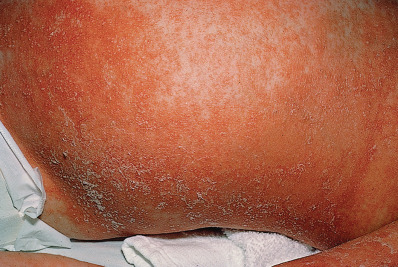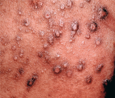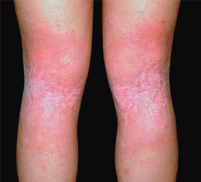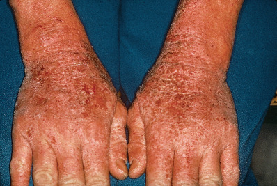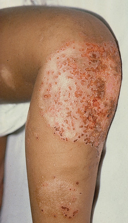 The word eczema seems to have originated in 543 ad and is derived from the Greek word ekzein, meaning to “to boil forth” or “to effervesce.” The term encompasses such disorders as dyshidrotic eczema and nummular eczema (NE), but at times is used synonymously for atopic dermatitis (atopic eczema). The acute stage generally presents as a red edematous plaque that may have grossly visible, small, grouped vesicles. Subacute lesions present as erythematous plaques with scale or crusting. Later, lesions may be covered by a drier scale or may become lichenified. In most eczematous reactions, severe pruritus is a prominent symptom. The degree of irritation at which itching begins (the itch threshold) is lowered by stress. Itching is often prominent at bedtime and usually results in insomnia. Heat and sweating may also provoke episodes of itching.