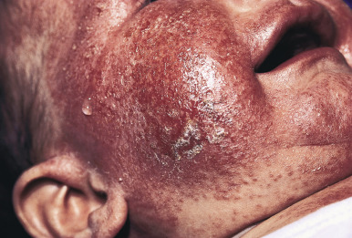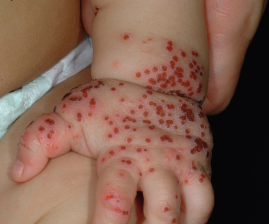 Langerhans cell histiocytosis (LCH) most commonly occurs before 3 years of age (see Chapter 10 ). In affected neonates, reddish-brown, purpuric, crusted papules or vesiculopapules are typically present. In infants this skin eruption is often characterized as a scaly, erythematous seborrheic eruption on the scalp, behind the ears, and in the intertriginous regions. On close inspection the presence of reddish-brown, petechial or purpuric lichenoid papules or vesicular or crusted papules in infants is typical. Cutaneous biopsy and identification of CD1a+ Langerhans cells by immunostaining confirms the diagnosis of LCH.