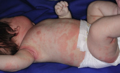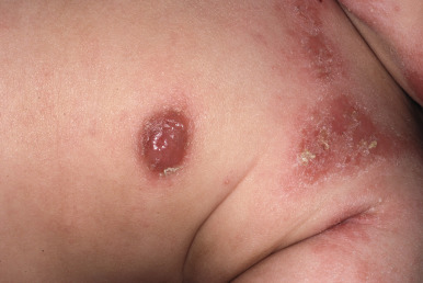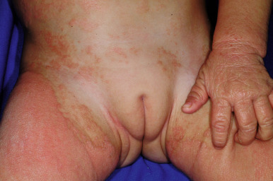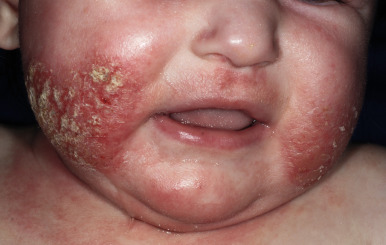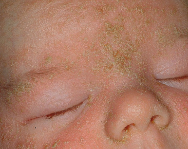 Seborrheic dermatitis is characterized by a greasy yellow or salmon-colored scaly eruption that may involve the scalp, cheeks, trunk, extremities, and diaper area. The major differentiating features include a tendency toward earlier onset, characteristic greasy yellowish or salmon-colored lesions with a predisposition for intertriginous areas, a generally well-circumscribed eruption, and a relative absence of pruritus (see below). Infants may show both atopic and seborrheic dermatitis (see Fig. 3-2 ), with progression or persistence of the atopic lesions as the seborrheic dermatitis subsides.