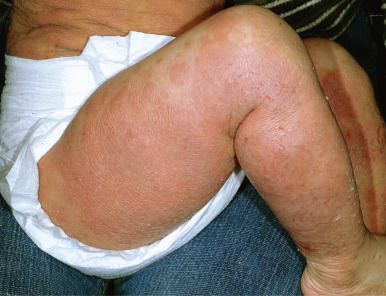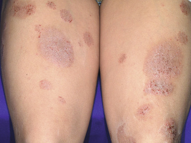 Nummular dermatitis is a distinctive disorder characterized by coin-shaped lesions. Measuring 1 cm or more in diameter, lesions of nummular dermatitis develop on dry skin and are more often seen during dry winter months. The eruption is characterized by discrete erythematous round plaques formed by the confluence of papules and vesicles ( Figs. 3-30 and 3-31 ). Nummular lesions tend to be more recalcitrant to topical therapy and, not uncommonly, become infected so that concomitant treatment of secondary staphylococcal infection and measures to limit staphylococcal overgrowth (such as dilute sodium hypochlorite baths) should be considered.