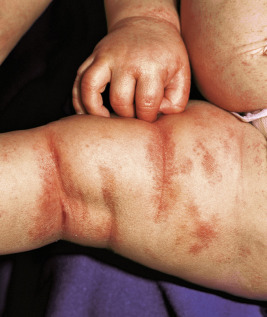 The dermatitis usually develops during the first few months of life and fulfils criteria for AD ( Fig. 3-36 ). Excoriated areas commonly have serosanguineous crust and often show petechiae or purpura. IgE-mediated allergic problems such as urticaria, food allergies, and asthma are also seen with increased frequency.