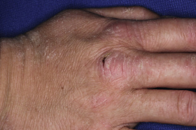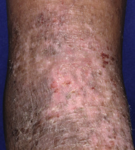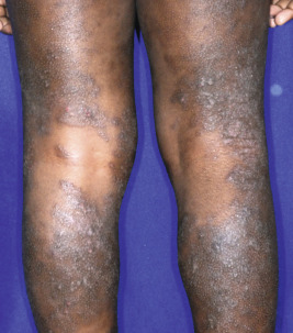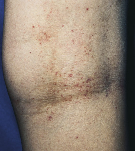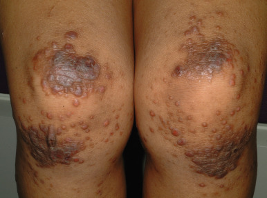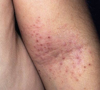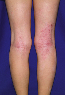 The adult phase of AD begins later in childhood and often continues into adulthood. Predominant areas of involvement include the flexural folds ( Fig. 3-15 ), the face and neck, the upper arms and back, and the dorsal aspect of the hands, feet, fingers, and toes. The eruption is characterized by dry, scaling erythematous papules and plaques and by the formation of large lichenified plaques from lesional chronicity. Weeping, crusting, and exudation may occur from the AD itself, but usually is the result of superimposed staphylococcal infection or allergic contact dermatitis (ACD). Prurigo nodularis, well-circumscribed, usually hyperpigmented thickened papules, most common on the lower extremities, is most commonly seen during adolescence ( Fig. 3-16 ).