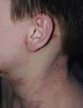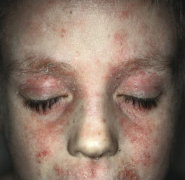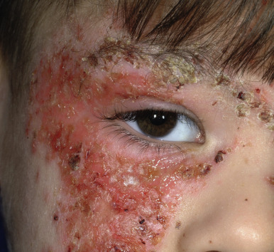 Hospitalization may be necessary, especially in infants under 1 year of age and in association with fever and/or systemic symptoms. Early administration of acyclovir has been shown to lead to better outcomes for EH, and use of topical corticosteroids or calcineurin inhibitors has not been associated with poorer outcomes in children hospitalized with EH. Systemic antibiotics should be administered if secondary bacterial infection is strongly suspected but should not be used empirically. Eczema vaccinatum was a problem when smallpox vaccinations were compulsory, most commonly contracted by accidental contact with a recently vaccinated individual. The global threat of bioterrorism and consideration of smallpox vaccinations has again brought to attention the risk of eczema vaccinatum for patients, particularly children, with AD. Eczema vaccinatum is characterized by the widespread cutaneous dissemination of vaccinia viral lesions that manifest as firm, deep-seated vesicles or pustules that are all in the same stage of development (see Chapter 15 ). Lesions may become umbilicated or confluent. Eczema coxsackium is a recently coined term to describe the unusual cutaneous concentration in sites of previous or current AD of vesicles and erosions from Coxsackie A6 and, less commonly, Coxsackie A16 infection, which could be confused with EH. Fever, oral erosions/ulcerations, and sore throat/mouth are among the most common associated symptoms. Lesions clear spontaneously in an average of 12 days but may persist for a month. Reactivity to Malassezia has been blamed for recalcitrant AD of the head and neck in adolescents. Although there are no documented differences in Malassezia species colonization, patients with head and neck AD are more likely to have positive skin-prick test results and Malassezia -specific IgE compared with healthy control subjects and patients with atopy without head and neck dermatitis. These patients may benefit from a 1- to 2-month course of daily itraconazole or fluconazole followed by long-term weekly treatment.