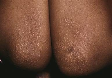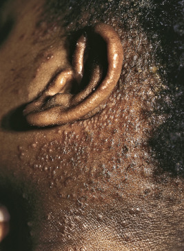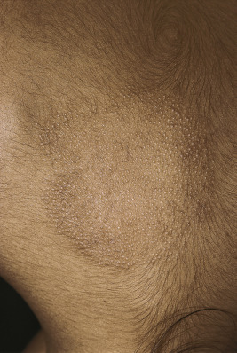 Lichen spinulosus manifests as round collections of numerous tiny, skin-colored to hypopigmented dry spiny papules ( Fig. 3-21 ). More common in African-American children, lichen spinulosus usually occurs on the trunk or extremities. Lesions tend to be asymptomatic and may respond to application of emollients and mild topical corticosteroids. Children with AD also show an increased incidence of pityriasis alba, nummular dermatitis, dyshidrotic eczema, and juvenile plantar dermatosis (see related sections).