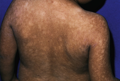The differential diagnosis of the hypopigmented macules of pityriasis alba includes tinea versicolor, vitiligo, the white macules seen in association with tuberous sclerosis; nevus depigmentosus; cutaneous T-cell lymphoma; leprosy; postinflammatory hypopigmentation secondary to atopic dermatitis, psoriasis, tinea corporis, or pityriasis rosea; and in light-skinned individuals, nevus anemicus. Application of mild topical corticosteroids or calcineurin inhibitors for a few weeks followed by frequent emollition and protection of the sites and surrounding area from sun exposure appears to diminish the dry skin and fine scaling, allowing repigmentation of involved areas. Patients and parents should be warned that, as with postinflammatory hypopigmentation, repigmentation may take several months to years. Effective moisturization during drier months may help prevent recurrence of the pityriasis alba in subsequent summers.