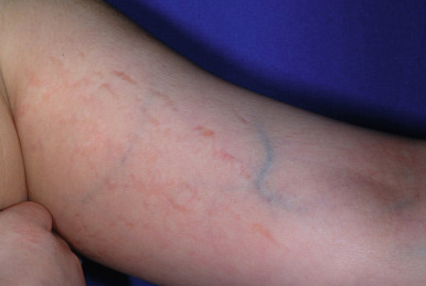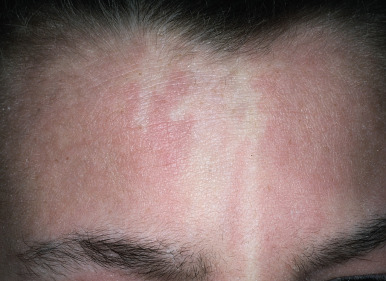 Several other clinical signs are seen with increased incidence in children with AD, although they may appear in children without AD as well. Dermographism, a manifestation of the triple response of Lewis that occurs in approximately 5% of the normal population, is characterized by a red line, flare, and wheal reaction. A red line develops within 15 seconds at the exact site of stroking, followed within 15 to 45 seconds by an erythematous flare (because of an axon-reflex vasodilation of arterioles). The response finally eventuates in a wheal (because of transudation of fluid from the injured capillaries in the original stroke line) 1 to 3 minutes later. Individuals with AD often demonstrate a paradoxical blanching of the skin termed white dermographism ( Fig. 3-20 ). The initial red line is replaced, generally within 10 seconds, by a white line without an associated wheal. Patients with AD may also show circumoral pallor, thought to relate to local edema and vasoconstriction.