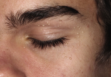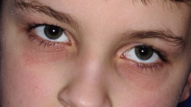Individuals with atopic disorders have a distinct tendency toward an extra line or groove of the lower eyelid, the so-called “atopic pleat” ( Fig. 3-22 ). Seen just below the lower lid of both eyes, the atopic pleat may be present at birth or shortly thereafter and is often retained throughout life. This groove (commonly referred to as a Dennie–Morgan fold ) may result from edema of the lower eyelids and skin thickening; it represents a feature of the atopic diathesis rather than a pathognomonic marker of AD. The atopic pleat has been found with increased incidence in African-American children. Slate-gray to violaceous infraorbital discolorations (“allergic shiners”), with or without swelling, are also seen in patients with allergies and in patients with AD. Allergic shiners are thought to be a manifestation of vascular stasis induced by pressure on underlying venous plexuses by edema of the nasal and paranasal cavities; the swelling and discoloration become more prominent as a result of repeated rubbing of the eyes and postinflammatory pigment darkening. Another clinical feature, an exaggerated linear nasal crease, is caused by rubbing of the nasal tip (the so-called “allergic salute”) and occurs in 7% of schoolchildren. Milia (tiny inclusion cysts; see Chapter 9 ) of the periorbital area are common in preadolescents ( Fig. 3-23 ), may resemble acne, and are thought to result from the recurrent rubbing.
