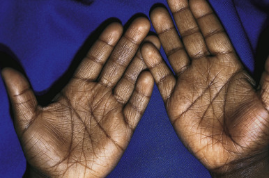 Many patients with atopic conditions exhibit an increased number of fine lines and accentuated markings of the palms ( Fig. 3-24 ). These accentuated palmar markings often are a clue to the concurrent diagnosis of ichthyosis vulgaris (see the previous discussion of the pathomechanism and also Chapter 5 ), a relatively common semi-dominant genetic disorder seen with increased incidence in children with AD. Although individuals with either AD or ichthyosis vulgaris may show accentuated markings on the palms and soles, the characteristic generalized scaling with larger and more severe scaling on the lower extremities, worsening during winter months, and often positive family history of patients with ichthyosis vulgaris further helps to distinguish these conditions.