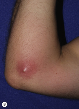 Although methicillin-resistant S. aureus (MRSA) colonization and superinfection of AD is increasing, the majority of children with AD harbor methicillin-sensitive S. aureus (MSSA). MRSA infection may manifest as pustules ( Fig. 3-27, A ), abscesses ( Fig. 3-27, B ) or crusting that is indistinguishable clinically from MSSA infection but much more difficult to eradicate; suppression of MRSA often requires that the entire family (including pets, who can harbor MRSA) be treated initially or even on an intermittent basis to reduce colonization and familiar infections, such as with intranasal mupirocin ointment and once to twice weekly bleach baths or sodium hypochlorite-containing cleansers.