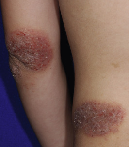 The lesions of psoriasis, another common skin disease of children, are bright red and topped with loosely adherent silvery micaceous scale (see Chapter 4 ). Psoriatic lesions usually show a sharply delineated edge and have a predilection for the extensor surfaces (particularly the elbows and knees), the scalp, the buttock, and the genital regions. Approximately 5% of children with psoriasis also show dermatitis, either as typical psoriasis and atopic dermatitis lesions or a psoriasiform dermatitis; these children often have a family history of both atopy and psoriasis.